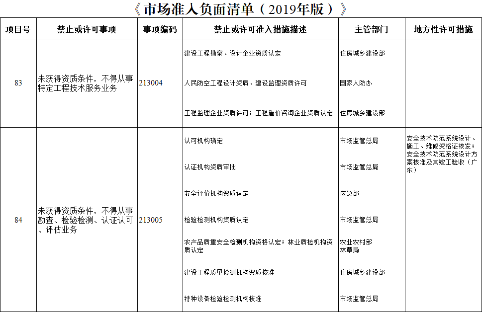 《市場準入負面清單(2019年版)》第83項"未獲得資質條件,不得從事特定工程技術服務業務"中,已沒有了“消防技術服務機構資質審批”